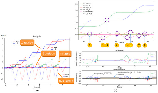 Determining the GC’s eight states. (a) Annotated time points of the eight states in each gait cycle; (b) top: x distance, z height, and pitch angle and bottom: gyroscope and accelerometer data.