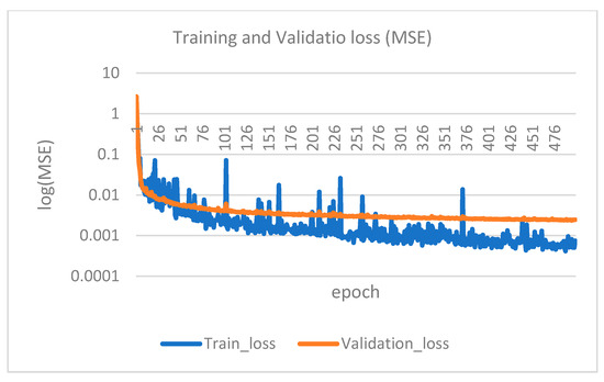 The computer specifications for running the program are an Intel i7-12700H/2.30 GHz CPU (Santa Clara, CA, USA) and a Nvidia GeForce RTX 3060 GPU (Santa Clara, CA, USA). Training the 11-layer 1D CNN model with 96 data entries takes approximately 3 s per epoch. If only the CPU is used for training, it takes about 60–120 s. Figure 14 shows the training and validation loss (mean squared error, MSE) curve, and Figure 15 shows the prediction results after training with the epoch set at 500. The root of the MSE of the test data (24 data entries) is 5.42 cm, which is accurate enough for engineering purposes.