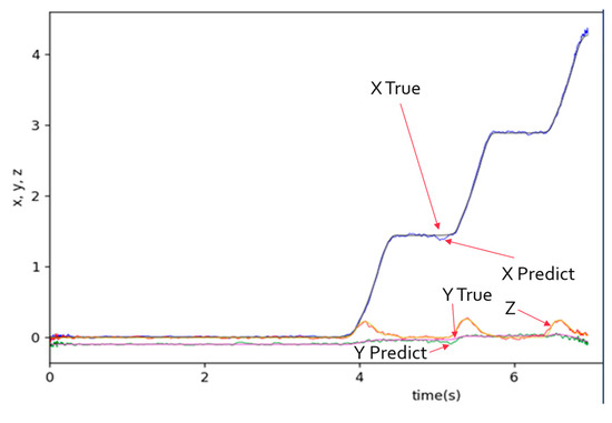 Although NGIMU provides good static angular velocity and has a built-in AHRS algorithm, the accumulated error in calculating XYZ coordinates still exists, which can be observed in the left diagram of Figure 11. The diagram shows that the final X-distance exceeds 10 m, the final Y-distance is apart from the walking straight line by 2 m, and the Z-distances (height) of the GC’s double support are not zero (unrealistic floating above the floor). These errors make the gait data not practical to use. Therefore, a calibration process becomes essential. In this paper, a simple yet accurate enough calibration is proposed by using the special characteristics of 10 m linear walking. The calibration outcomes are satisfactory, which can be observed from the right diagram in Figure 11 and Figure 12. The final X-distance is at 10 m, the Y-distance is close to the walking straight line, and the Z-distance (height) is periodic and is zero at double support states.