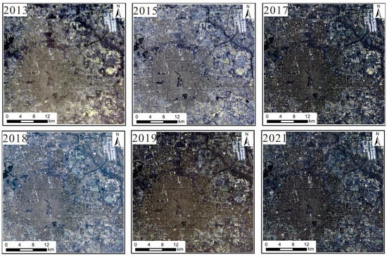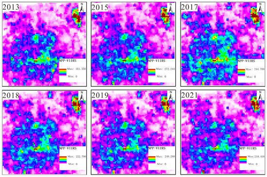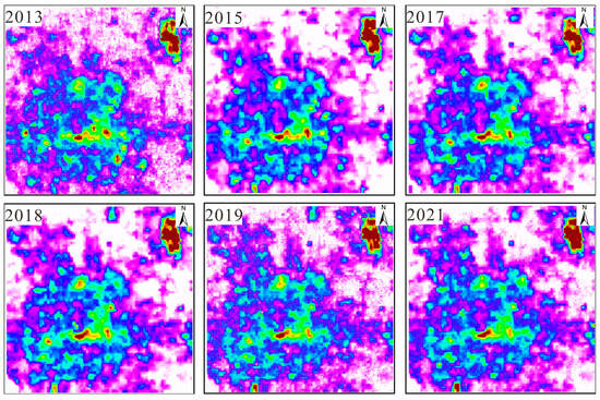 - Based on the above methods, color nighttime light remote sensing imagery of Beijing for 2013, 2015, 2017, 2017, 2019, and 2021 was generated. The results are shown in Figure 5 and Figure 6.