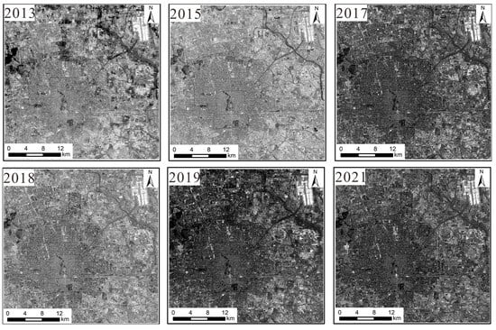 - Landsat 8 data: These data were sourced from the Geospatial Data Cloud. This refers to Landsat 8OL-TIRS (OLI = Operational Land Image; TIRS = Thermal Infrared Sensor) images covering Beijing for the period from 2013 to 2021, where OLI is mainly in the visible to short-wave infrared bands and TIRS is in the thermal infrared band. This study uses OLI data, which contain multispectral images with a resolution of 30 m and panchromatic images with a resolution of 15 m. The radiometric calibration removes the error caused by the difference in sensor response; the atmospheric correction further removes the atmospheric scattering and absorption effects to obtain the true reflectance of the ground surface, and the panchromatic images are radiometrically calibrated to correct the radiometric distortion caused by atmospheric effects to ensure the clarity of spatial details. The fidelity of the pre-processed images is greatly improved, and the color distortion is reduced during fusion. Finally, the images are mosaicked and extracted from the regional map to obtain the multispectral images and panchromatic remote sensing images for 2013–2021. The results are shown in Figure 2 and Figure 3.