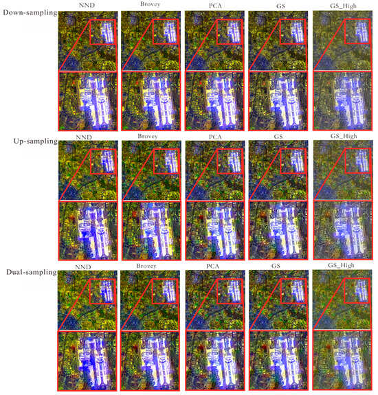 The red square area clearly shows that the spatial detail of NND, Brovey, PCA, GS, and GS_High has been enhanced by the dual-sampling adjustment. This is especially true for the edges of buildings, residential areas, and river water bodies, where the contours are clearer. Compared with GS and GS_High, the images transformed using NND, Brovey, and PCA are blurred in low-light areas, which makes it impossible to visualize the detailed textures of the features. In terms of spectral retention effect, the texture of GS_High features is more obvious than that of GS.