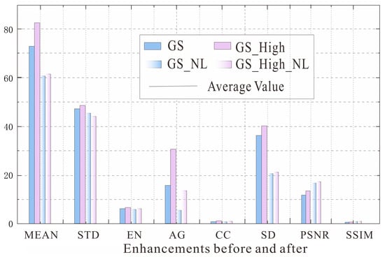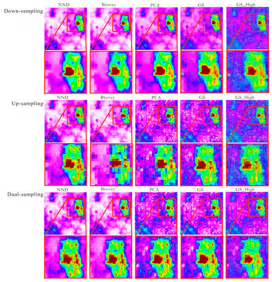 The down-sampled image has the highest AG, with GS performing the best and Brovey performing the best in terms of STD. In addition, CC and SSIM are the lowest and have the largest distortion. The up-sampled image has the highest CC and PSNR. It is lower in terms of MEAN, STD, EN, and AG, but the GS and PCA transforms perform better in these aspects. The images generated by using dual-sampling adjustment and their third band perform best in terms of MEAN, STD, EN, CC, and PSNR; especially, the evaluation indicators of NDD, Brovey, PCA, and GS transforms are all improved. This indicates that the image adjusted by using dual-sampling performs better in terms of the average brightness and pixel dispersion and has the best ability to maintain spectral features. Among them, the indicators processed by GS are more stable, so a high-pass filter algorithm is used for enhancement, as shown in Figure 10.