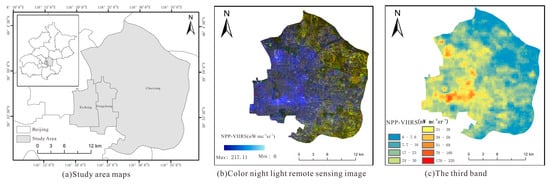 Chaoyang District, Dongcheng District, and Xicheng District of Beijing were selected as the research areas. These three areas are located in the central urban districts of Beijing, covering different socio-economic characteristics, including commercial centers, historical and cultural heritage areas, and high-end residential areas. This provides a deeper understanding of the living conditions of urban residents and the level of economic development, as shown in Figure 11a–c.