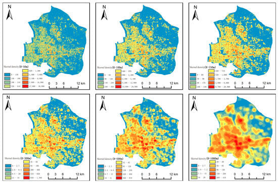 In the formula, is the kernel density function and is the scaling function of the kernel density function. h is the smoothing parameter of the bandwidth, and n is the total number of samples. An appropriate bandwidth R has a significant impact on the research results. Therefore, a bandwidth of 50–1000 m was chosen, as shown in Figure 13.