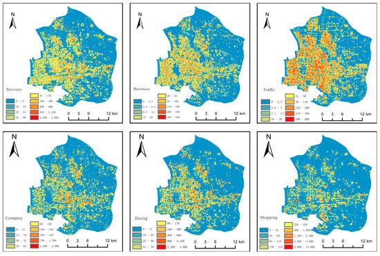 By comparing Figure 13, it was found that the density center is more stable between bandwidths of 100–150 m. Therefore, 150 m was chosen as the bandwidth for kernel density, with a pixel size of 15 m. Then, the six urban functional types were analyzed, and the results are shown in Figure 14.