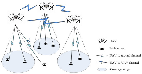 Unmanned aerial vehicles (UAVs) can function as mobile relay stations equipped with communication equipment, enable temporary mobile communication base stations, and improve signal coverage and communication quality [1,2]. Relay UAVs offer the advantages of high flexibility and can be deployed at high altitudes, thereby enhancing the probability of line-of-sight (LOS) transmission. Thus, UAVs offer significant benefits to wireless communication systems [3,4,5]. Several dynamic users typically exist in the context of relay UAV wireless communication tasks, and dynamic user mobility causes the operational area of the relay UAVs to change during task execution. Therefore, the service area of a relay UAV must be flexibly adjusted in response to changes in the communication service users [6]. During communication missions, relay UAVs often need to serve dynamically changing communication users, such as people in disaster areas or crowds in complex environments. The number and location of ground users change continuously, leading to dynamic variations in the service areas of relay UAVs [7].