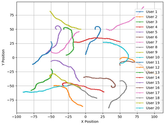 The Gaussian–Markov mobility model was selected to simulate the user mobility process [19]. Figure 2 illustrates the process of simulating user movements using this model. The model is used to simulate smooth changes in user positions and velocities during movement. By introducing the Markov model, the user’s velocity and direction at the next time step are updated based on the user’s state at the previous time step. This approach renders user movements more consistent with the actual physical laws. In two-dimensional space, the user’s velocity and direction are updated according to Equations (1) and (2).