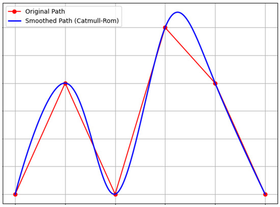 The Catmull–Rom spline is a commonly used interpolation spline curve, characterized by its ability to generate smooth curves that pass through all control points. In Figure 4, the red path denotes before smoothing, and the blue path represents after smoothing. The Catmull–Rom spline is particularly suitable for scenarios that require paths to strictly cover the target points; it only changes the path around the deployment points without affecting the entire path. Therefore, the path can be adjusted locally to avoid obstacles and satisfy specific constraints. The smoothed curve generated by this method passes directly through all deployment points, ensuring that the smoothed path can still accomplish the task of covering dynamic users. Therefore, this study adopts the Catmull–Rom spline to smoothen the UAV paths.