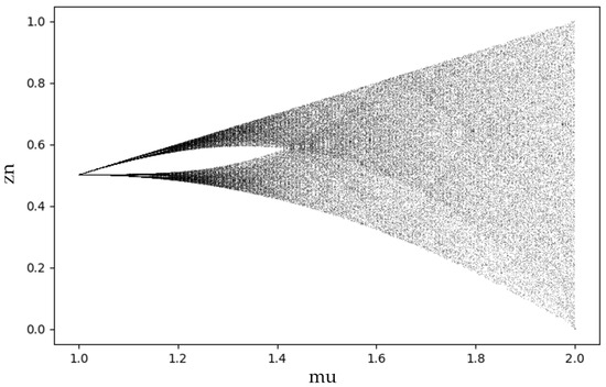 As increases, the system’s behavior transitions from a stable state to an unstable state, exhibiting bifurcations. As depicted on the right-hand side of Figure 5, the behavior becomes more complex, with multiple branches and chaotic regions. In this bifurcation diagram, the state variable presents a dense distribution of points across the entire range of , indicating that the Tent map sequence is evenly distributed across all possible states.