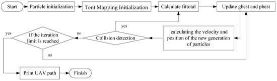 This study combined Tent mapping with PSO to solve the UAV path-planning problem to cover dynamic users. The algorithm first uses Tent mapping to initialize the UAV positions and then calculates the fitness of each particle using the objective function . The best solution is selected as the individual best position. Then, based on the fitness values and the improved ,,, the particle’s next position can be calculated. If this position causes a collision, the second-best solution is chosen instead, and the process continues until the maximum number of iterations is reached. The algorithm flowchart is shown in Figure 7.