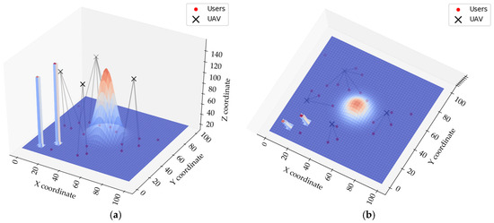 Figure 9 shows all the deployment points generated by the UAVs based on user movement. As users moved to the ground, the UAV deployment positions changed accordingly. After each iteration, the UAVs used the PSO algorithm to calculate the individual best value and the global best value , which were then compared to the current fitness value to determine whether new coverage points needed to be generated.