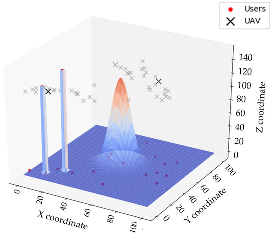 To verify the rationality of the proposed improved PSO, a simulation experiment on the UAV coverage for moving users was conducted using Python 3.7. To ensure the rigor of the meticulousness, we set obstacles in the environment with a specific distribution, using rectangular prisms to represent buildings and a 2D Gaussian function to represent mountainous terrain.