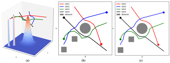 By contrast, Figure 10c shows the results obtained after path smoothing. It is evident that the smoothed UAV paths were more stable during flight, reducing unnecessary path oscillations and improving flight efficiency and safety. In addition, sharp turns in the original path introduced additional energy consumption to the UAV. The smoothed paths allowed the UAV to make more efficient use of its onboard energy while executing tasks, extending flight duration and increasing the task completion rate.