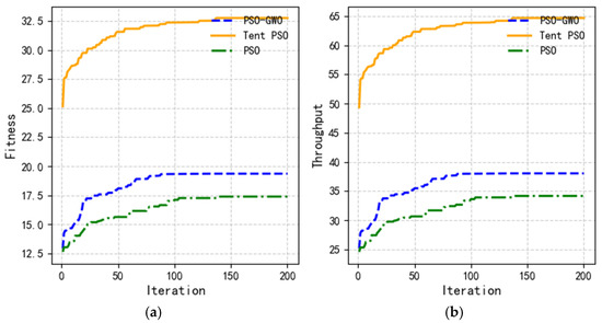 The proposed Tent–PSO was compared to the other two algorithms in terms of fitness function, throughput, and coverage. Figure 10 shows the variation curves of the average values for different algorithms as the number of iterations increases. As shown in Figure 11a, the fitness of all three algorithms increased with the number of iterations. After iteration, the fitness values for PSO-GWO and traditional PSO were 18.54 and 16.41, respectively, whereas Tent–PSO achieved a fitness of 31.79, far exceeding those of the other two algorithms. The figures show that PSO-GWO and PSO converged faster, indicating that these algorithms are likely to become stuck in local optima.