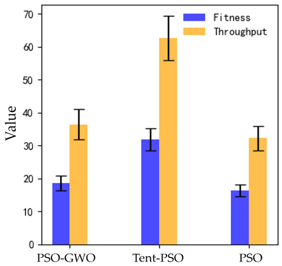 Figure 13 and Figure 14 present the error analysis of the fluctuation range of the results for each algorithm across the five experiments. Figure 13 presents the error analysis results of fitness and throughput. Although Tent–PSO exhibited larger error fluctuations, it consistently maintained higher fitness and throughput values.