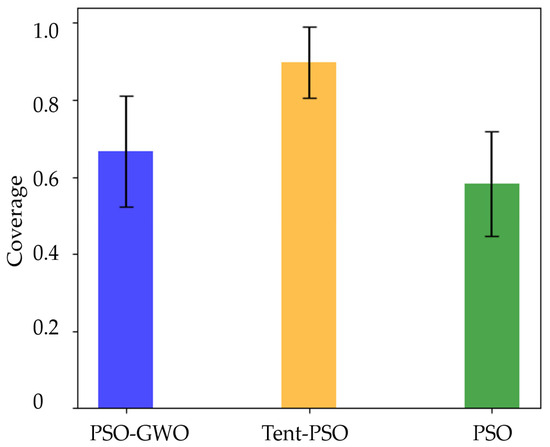Figure 14 shows the error analysis of the coverage. Tent–PSO consistently maintained a higher coverage rate with smaller error fluctuations, indicating that it has better coverage stability in dynamic environments. The error analysis data for the three algorithms are summarized in Table 2.