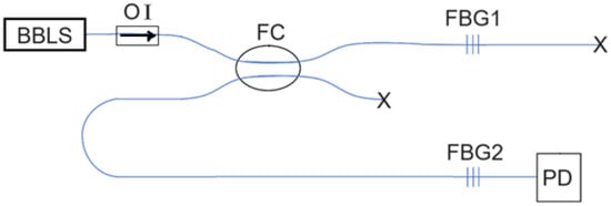 Optical power detection scheme to acquire vascular pulsation waveform with two identical FBGs used. BBLS: broadband light source; OI: optical isolator; FC: 3 dB fiber coupler; FBG1 and FBG2: fiber Bragg gratings; PD: photodetector. The symbol X denotes no Fresnel reflection from fiber end faces.