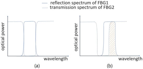 Reflection spectrum of FBG1 and the transmission spectrum of FBG2 (a) when FBG1 does not bear any vascular pulsating stress, and (b) when FBG1 bears some vascular pulsating stress.