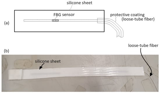 (a) Schematic diagram showing a protective structure for protecting an FBG sensor and its adjacent bare fiber. (b) The silicone sheet with an FBG, its adjacent bare fiber, and a part of loose-tube fiber embedded inside.
