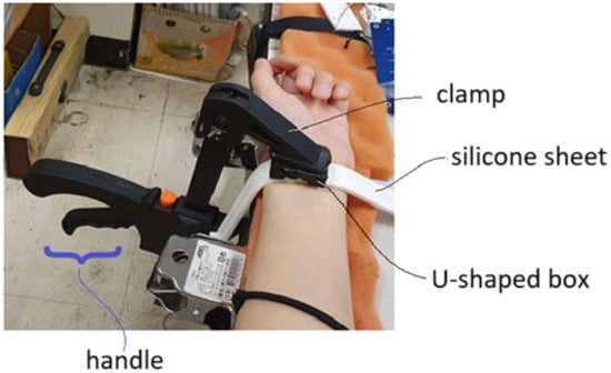 When the FBG sensor embedded inside a silicone sheet is positioned near the radial artery of a subject’s wrist, a U-shaped box is used to press the silicone sheet to not only make the silicone sheet closely contact with the skin of the wrist but also to enhance the vascular pulsation sensing capability. The U-shaped box is pressed by a clamp to make its legs tightly touch the silicone sheet, as shown in Figure 4. This figure schematically shows that the clamp can be moved up and down by controlling a handle. The wrist is put on a table and the handle touches firmly the side of the table for the clamp to move up and down. When the clamp is moved downwards to press the U-shaped box, the legs of the U-shaped box tightly touch the silicone sheet. When the clamp is moved upwards, the wrist of the subject can move out.