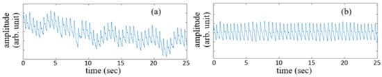 The vascular pulsation waveforms of a subject acquired for 25 sec before signal treatment and after signal treatment are shown by the traces in Figure 6a,b, respectively. The untreated signal waveform corresponds to the detected originally by the PD, while the use of a bandpass filter with a band from 0.5 Hz to 12 Hz for the untreated signal waveform gives the vascular pulsation waveform shown in Figure 6b.