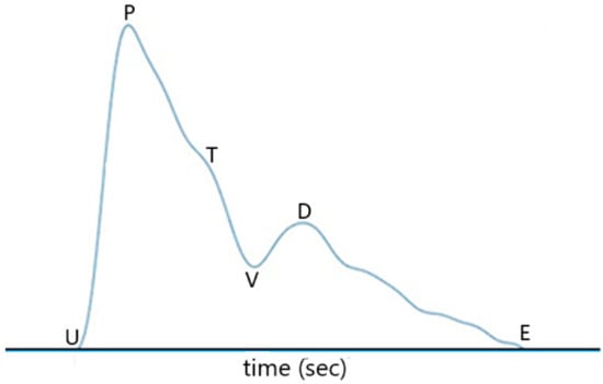 Each pulse of the filtered signal waveform shown in Figure 6b can be used for the estimation of blood pressure and heart rate. All of the pulses acquired during a certain time period, which is set to be 25 sec in this study, almost have the same shape as that shown in Figure 7, where U represents the onset point for blood ejection from the left ventricle when the heart contracts, P is the peak of the percussion wave during systole, T represents the tidal wave, V is the valley of the pulse representing the beginning of diastole (i.e., the descending wave trough point), D is the peak of the dicrotic wave, and point E represents the end of diastole. In Figure 7, the time interval between point P and point D is defined as PTT, the same as in [20]. The time interval from point U to point P is defined as Pt, named by pulse ascending time herein. The time interval from point D to the end point E of the pulse waveform, which is normally the onset point of the next pulse waveform, is defined as Dt, named by pulse descending time herein. The heart rate can be obtained from the repetition rate of the filtered pulse waveform signal in Figure 6. In other words, the heart rate can be obtained from the repetition rate of point U, point P, point V, or point D of the pulse waveform.
