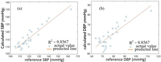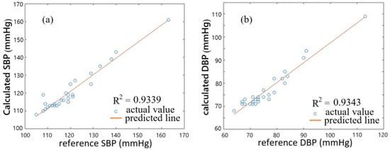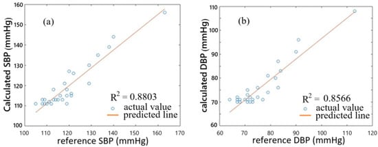 Correlation plots of calculated BP values against reference BP values for 29 subjects. (a) is for SBP and (b) for DBP.