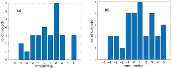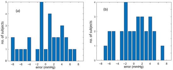 Error distributions of calculated BP values and reference BP values for the 29 subjects. (a) is for SBP and (b) for DBP.