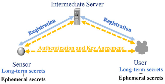 26], leaving these schemes vulnerable to ephemeral secret leakage (ESL) attacks. Furthermore, many protocols lack essential features, such as perfect forward security (PFS) and anonymity. They are also prone to offline password guessing attacks and are inefficient for resource-constrained IoT devices. More importantly, with the rapid growth regarding IoT devices, intermediate servers must manage a large number of users and device connections, which makes the performance of authentication schemes highly dependent on the server’s computational and processing capabilities [