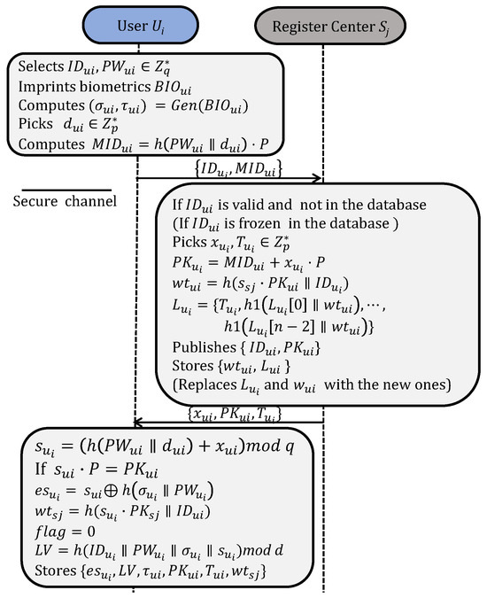 During authentication, each is used only once, regardless of whether authentication is successful, and the values of and other authentication parameters are unique for each session. Furthermore, due to the secrecy of and , even insider users of RC cannot determine . As a result, the scheme ensures anonymity and untraceability.