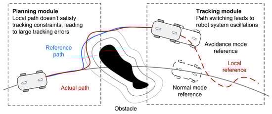 Based on the above discussion, existing hierarchical frameworks typically neglect information integration between the local path planning and tracking stages. Thus, as shown in Figure 1, these methods have two critical limitations: (1) the control layer, uninformed by planning constraints, fails to adapt to trajectory modifications during tracking, potentially inducing system oscillations during mode transitions (e.g., normal operation to obstacle avoidance); and (2) the planned trajectories, generated without considering control dynamics, may violate the robot’s kinematic and dynamic characteristics, resulting in significant tracking errors that could precipitate unintended collisions. These limitations fundamentally lead to poor autonomous navigation performance of mobile robotic systems in dynamic environments. Therefore, navigation with simultaneous consideration of control and planning is of research value. Consequently, we proposed a framework for robotic navigation that integrates the control and planning stages in this paper. The following issues are considered: