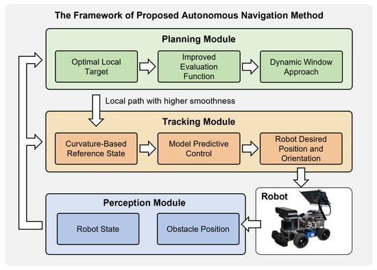 Figure 2. The framework of the proposed autonomous navigation method. - For the local path planning module, an online local target point selection strategy was developed to address the limitations of conventional planning methods that inadequately consider the correlation between local and global paths, while simultaneously improving planning success rates across diverse environments. Additionally, building upon the standard DWA, we improved the path smoothness through modifications to the path evaluation function. These enhancements provide convenience for the subsequent control module.