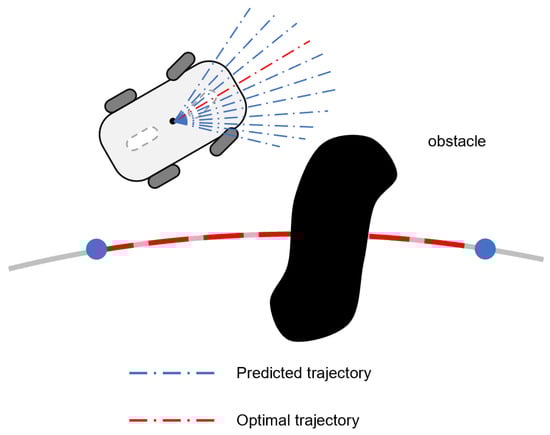 DWA is a well-established local path planning methodology capable of generating collision-free trajectories, demonstrating particular effectiveness in real-time navigation scenarios [30,31]. The approach operates within a velocity window defined by angular velocity and linear velocity v parameters. The evaluation function simultaneously optimizes for obstacle avoidance, motion smoothness, and target convergence. The velocity vector achieving maximum evaluation score is selected as the optimal velocity command for subsequent planning stages. Through this iterative process, DWA progressively constructs collision-free trajectories from initial position to the designated target [32], as shown in Figure 3. The subsequent control layer then executes trajectory tracking commands derived from this planned path, ultimately achieving collision-free navigation through coordinated planning–control interactions.