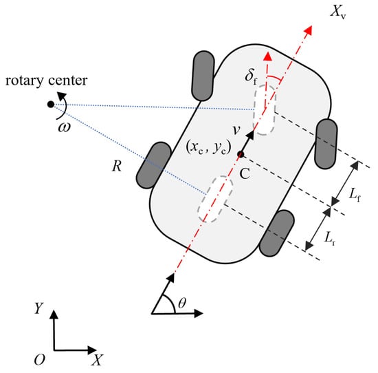 Under low-velocity operational conditions, kinematic modeling demonstrates superior fidelity in characterizing a system while maintaining structural simplicity, thus achieving prevalent adoption in mobile robotic systems. The kinematic model investigates the geometric dependencies governing mobile robots’ spatial-temporal behavior, incorporating analytical descriptions of positional coordinates, velocity profiles, and their temporal variations. Therefore, this paper employs the kinematic model to systematically examine motion planning and control strategies for autonomous navigation. As shown in Figure 5, let XOY denote the world coordinate system. Designating C as the robot’s center of mass, corresponds to its Cartesian coordinates in the XOY frame. The -axis orientation aligns with the robot’s heading direction, with specifying the angle between the -axis and the global X-axis, formally defined as the yaw angle. The steering angle is denoted by , while v and represent the linear velocity and angular velocity, respectively. and , respectively, indicate the longitudinal distances from the front/rear axles to the center of mass. The instantaneous center of rotation (ICR), determined by the intersection of virtual front-wheel steering axis and rear-wheel alignment perpendicular, generates the turning radius R measured from the vehicle’s central axis. Based on the above definition, the kinematic model of the mobile robot can be represented as: