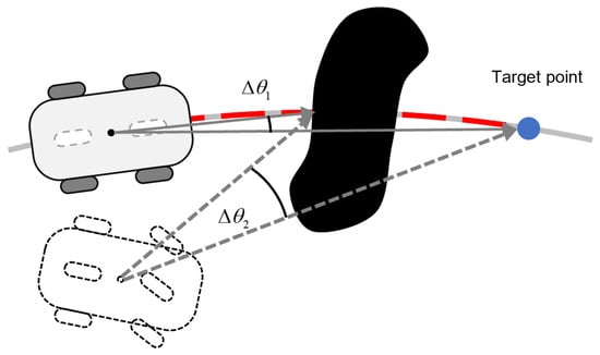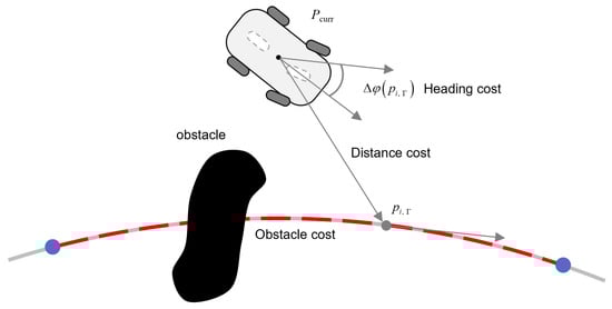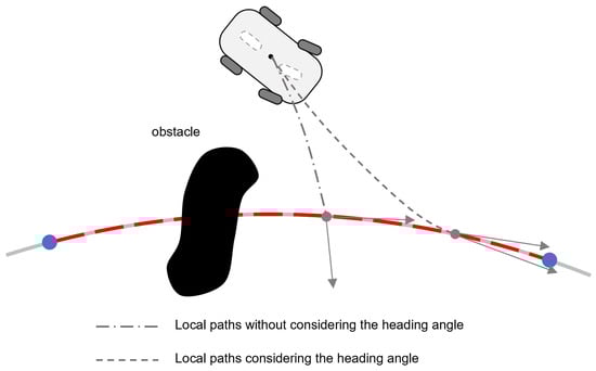 The formulation presented in Equation (15) demonstrates that proximal positioning of sub-target points relative to obstacles induces elevated cost values, thereby preventing path planning failures caused by obstacle occlusion of the target location. This cost mechanism simultaneously eliminates sharp turns associated with the proximity of local sub-target points to obstacles, improving motion smoothness. Furthermore, to guarantee fast reintegration of the mobile robot into the normal navigation mode after obstacle avoidance, spatial proximity between the local sub-target and the current position must be constrained, as presented in Equation (16). The heading cost (Equation (17)) primarily addresses transitional continuity between local path segments and the global path. Without this orientational component, the path planner will exhibit preferential selection of geometrically proximal targets relative to the initial planning position. Under such conditions, local paths asymptotically approach orthogonality relative to the global path’s directional vector at the target node, as illustrated in Figure 9, which significantly compromises motion stability during transitional maneuvers.
