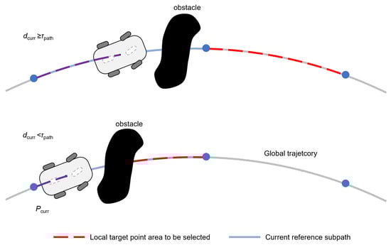 Building upon the fixed-interval sampling method, the global path undergoes uniform segmentation into m isomorphic sub-paths , each maintaining equal arc length . This decomposition transforms the holistic navigation task into sequential sub-goal tracking problems. During nominal tracking mode, the trajectory tracking controller ensures asymptotic convergence to each . Obstacle detection will trigger a conditional planning mode governed by the distance assessment. Let quantify the arc-length along current sub-path , and denote the switching threshold. As shown in Figure 7, the viable target region follows a threshold-based switching criterion: