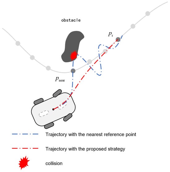 Upon obstacle detection, the locally planned path might undergo abrupt curvature variations such as sharp turns. In such scenarios, conventional controllers cannot respond promptly to these sudden changes due to their inability to anticipate upcoming road conditions. This could result in a significant tracking error from the reference path, potentially leading to unintended collisions with obstacles, even when a collision-free local path is successfully generated. To solve this problem, this section develops a curvature-adaptive reference point adjustment mechanism. When a detected curvature variation exceeds a predefined threshold, a forward-looking path point is activated as the preview-enabled reference, improving the prediction capability regarding the change in the path. During curvature stabilization phases, the reference point exponentially converges to the nearest point , preserving path tracking continuity.