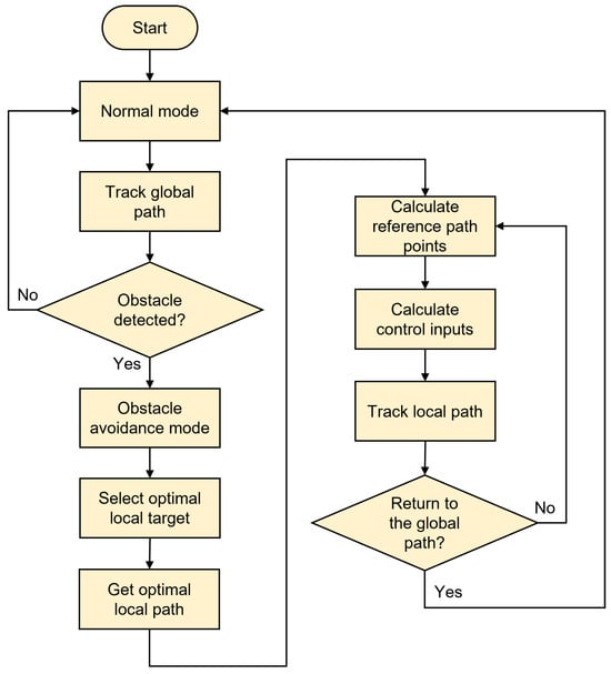 The maturation of robotics and cyber-physical systems has propelled mobile robots into critical roles across smart manufacturing and logistics ecosystems [1,2,3,4]. These autonomous platforms now constitute essential infrastructure for material handling and process automation in industrial production and warehouse management [5]. These operational environments typically exhibit dynamic uncertainty characterized by static and dynamic obstacles, including misplaced components or moving humans [6,7]. These dynamic interactions within the environment frequently interfere with the intended global trajectories of mobile robots, rendering the predefined paths ineffective [8,9]. Conventional fixed-path tracking systems prove inadequate in such non-stationary conditions, severely compromising operational efficiency and limiting industrial applications. Thus, to maintain operational continuity during different tasks, mobile robots must simultaneously achieve closed-loop trajectory following through advanced tracking controllers and real-time local reference path generation upon obstacle detection. This integration of real-time path re-planning with robust trajectory tracking forms the foundational requirement for the safe autonomous navigation of mobile robots.