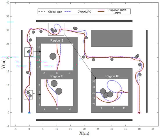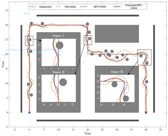 In this section, the proposed DWA will be selected as the basic local planning method, and a series of comparative experiments will be carried out using the standard MPC with , a PID controller (P = 1, I = 0.001, D = 20), and the proposed MPC as the tracking control methods. The actual trajectory output results are jointly determined by both the trajectory tracking control layer and the local path planning layer.