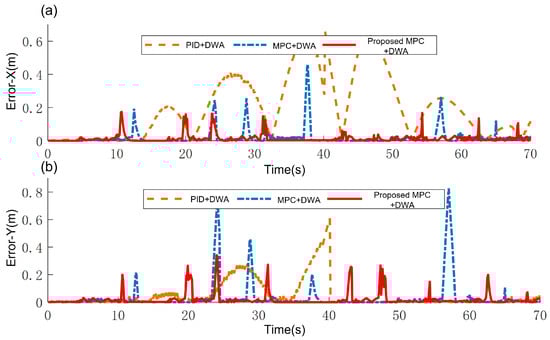 where represents instantaneous tracking error. As per Table 3, the proposed MPC method reduces x-direction errors by 56.04% compared to PID control and 44.91% versus standard MPC, with corresponding y-direction error reductions of 49.10% and 44.26%, respectively. These results confirm the framework’s superior tracking precision.