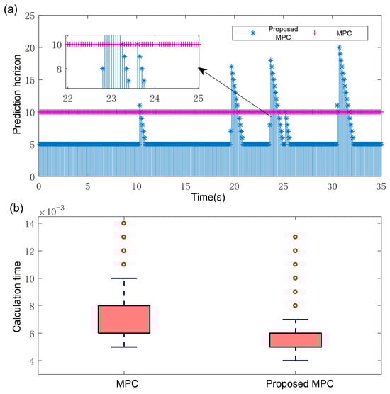 Figure 15a illustrates the dynamic evolution of prediction horizons for both the standard and proposed methods. Prediction horizon expansion correlates with sharp curvature transitions in reference paths. This adaptation enhances tracking precision during critical avoidance maneuvers while enabling rapid convergence to minimal permissible horizons upon normal mode recovery, thereby balancing computational efficiency. Figure 15b reveals the calculation time distribution. Due to the adaptive horizon changing strategy, the average prediction horizon is shorter, thus the computational burden is smaller. The proposed method achieved a 36.6% reduction in maximum computation time and 23.5% reduction in average computation time. Overall, the proposed MPC reduces the computational burden while ensuring high tracking accuracy.