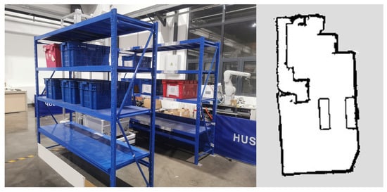 In this section, the proposed method will be validated using the experimental platform (shown in Figure 16), while the warehouse (shown in Figure 17) is selected as the experimental scenario. The experimental platform comprises an Ackermann-steering robotic system specifically designed for autonomous navigation. This physical prototype integrates an NVIDIA Jetson TX1 embedded computing unit with a Robot Operating System (ROS)-based architecture. The optimization problem is formulated and solved via the CasADi framework [33] with a nonlinear programming solver, maintaining a 10 Hz control loop frequency. For environmental perception, a planar LiDAR sensor with a 5 m maximum ranging capability and an inertial measurement unit (IMU) provide obstacle localization and ego-state estimation, respectively, with raw point cloud data processing implemented through Point Cloud Library. All software components were developed using the C++ programming language with ROS Melodic integration, ensuring real-time performance optimizations.
