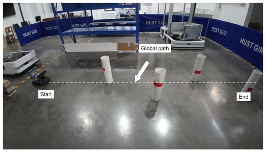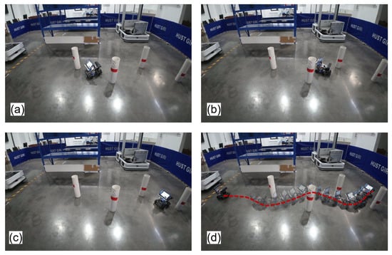 Figure 18 shows the experimental scene in this section and Figure 19 demonstrates the hierarchical planning–control framework’s real-time obstacle response capability. Upon detecting obstacles, the system activates the local path planning layer to generate a collision-free local trajectory while executing curvature-adaptive tracking maneuvers via the proposed MPC. The whole navigation progress is shown in Figure 19d. Through the local sub-target selection strategy, the mobile robot prioritizes navigation between two obstacles (narrow passage navigation, as shown in Figure 19a,b). Compared to moving from the same side of two obstacles, this preference makes the local path closer to the global path as much as possible while ensuring safety. Figure 19c shows the mobile robot bypassing the last obstacle and about to reach the end point.