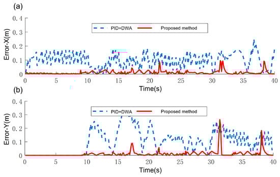 The proposed hierarchical strategy is benchmarked against PID control and baseline DWA, and the tracking error is shown in Figure 22. Quantitative analysis reveals 90.26% and 84.40% reductions in mean tracking errors (x: 0.113 m → 0.011 m; y: 0.109 m → 0.017 m), significant improvements validating the framework’s superior path-following accuracy. These precision gains directly translate to enhanced obstacle avoidance reliability, particularly critical in the space-constrained operational settings.