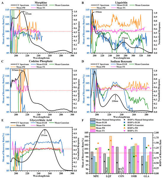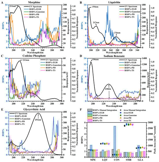When the value of normalized response was less than 0.05 (a critical point), the robustness and precision of the integration method were significantly reduced, which were reflected in the significant increase in the fluctuation of the RSD curve and the value of RSD, respectively. It should be noted in particular that when the value of the normalized response was less than 0.1, the precision evaluated by EGH was greatly affected (Figure 1B). This critical point reflected well in Figure 1A: at 254–277 nm (normalized response < 0.05), the RSD increased significantly. Meanwhile, at 277–291 nm (normalized response > 0.05), except for EGH, the RSD obtained by the other three integration methods declined. Critical points also appeared in Figure 1B (at 334–350 nm), Figure 1D (at 250–290 nm), and Figure 1E (at 283–300 nm).