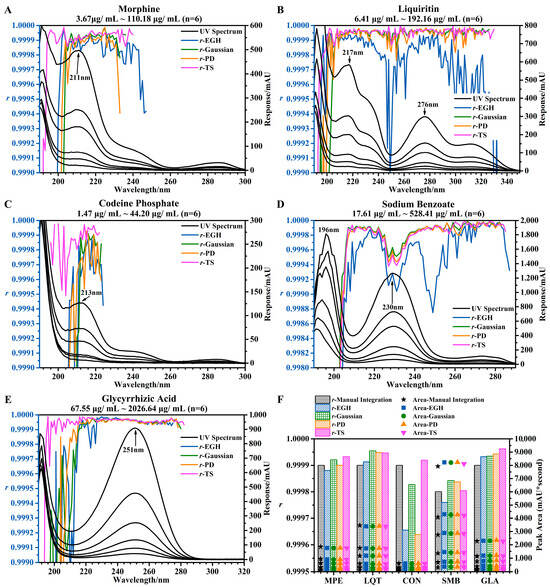 where x is the peak area, y is the concentration, and n is the number of determinations. It is worth noting that the three parameters (r, a, and b) obtained by different integration methods at different wavelengths were a little different, and b was applied for the calculation of accuracy (Section 4.1.3). The UV spectra of the five standards at six different concentrations and the trends of r of the five standards using four integration methods at different wavelengths are shown in Figure 2A–E.