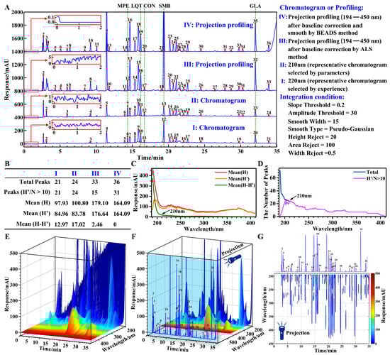 The chromatogram at 210 nm (Figure 4(A-II)) was selected by parameters as the representative chromatogram, due to the lower average baseline height (Figure 4C) and the higher number of quantifiable peaks (Figure 4D). In the range of 190–210 nm, the lower the wavelength, the more serious the baseline drift, the more the total peaks, but the less the quantifiable peaks (Figure 4C,D). This phenomenon indicated that baseline drift and noise may obscure a lot of useful information.