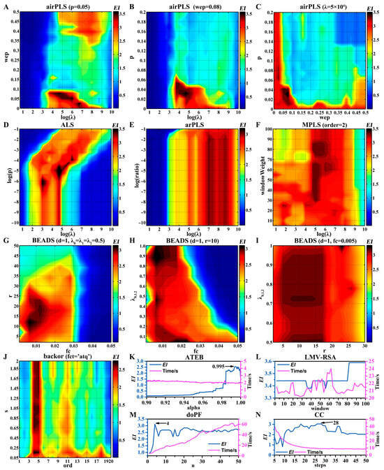 Optimization process of ten baseline correction algorithms using EI as an indicator. (A–C) airPLS. (D) ALS. (E) arPLS. (F) MPLS. (G–I) BEADS. (J) backor. (K) ATEB. (L) LMV-RSA. (M) doPF. (N) CC.