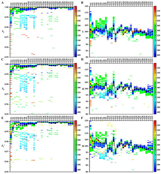 Effects of different wavelengths on similarity analyses. (A) SF. (B) L. (C) SR. (D) R. (E) SF′. (F) M. Colors represent wavelengths. The black dots represent the similarity analysis results of the projection profiles for the 33 batches of CLT samples.